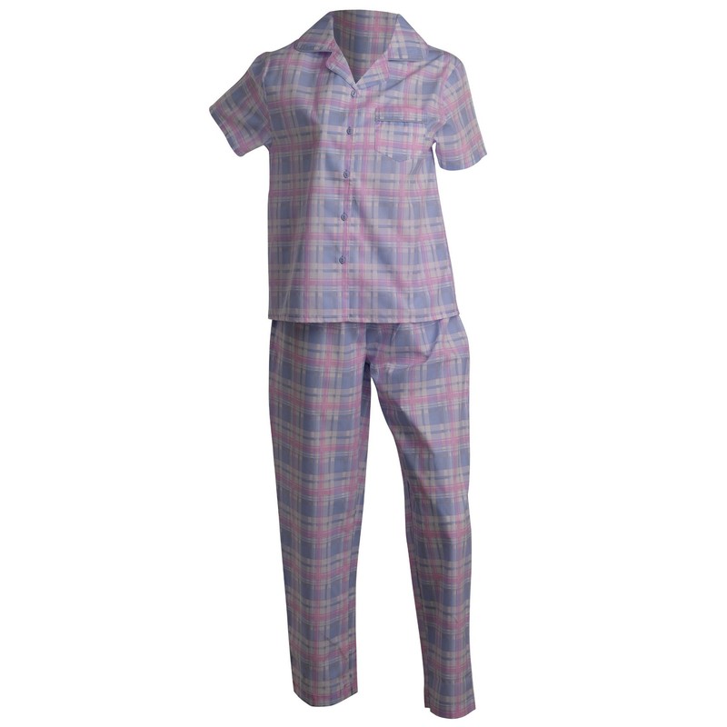- These ladies tartan check pyjamas sets by Slenderella include a short sleeved button up top with a chest pocket and a pair of full length trouser bottoms with an elasticated waist. These PJ sets are made from 65% polyester and 35% cotton, making them long lasting and easy care and perfect for keeping you cool during the warmer spring and summer months.