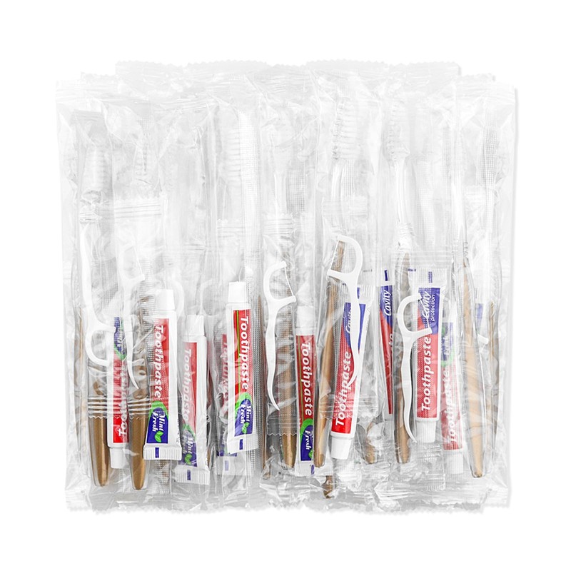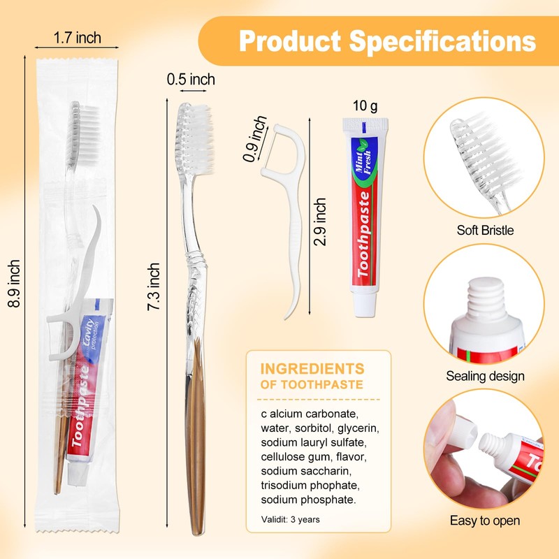 - SUFFICIENT QUANTITY: Bulk Toothbrush Toothpaste Floss Set comes with 200 pieces disposable toothbrushes in total. 200pcs classic gold toothbrush, can meet yourself and the whole family's daily replacement needs. SOFT FLOSS - Easily slides between teeth to remove unwanted and unsightly food debris. TOOTHPICK END - Removes additional plaque and food debris in tough to reach areas with protected tartar pick in handle.