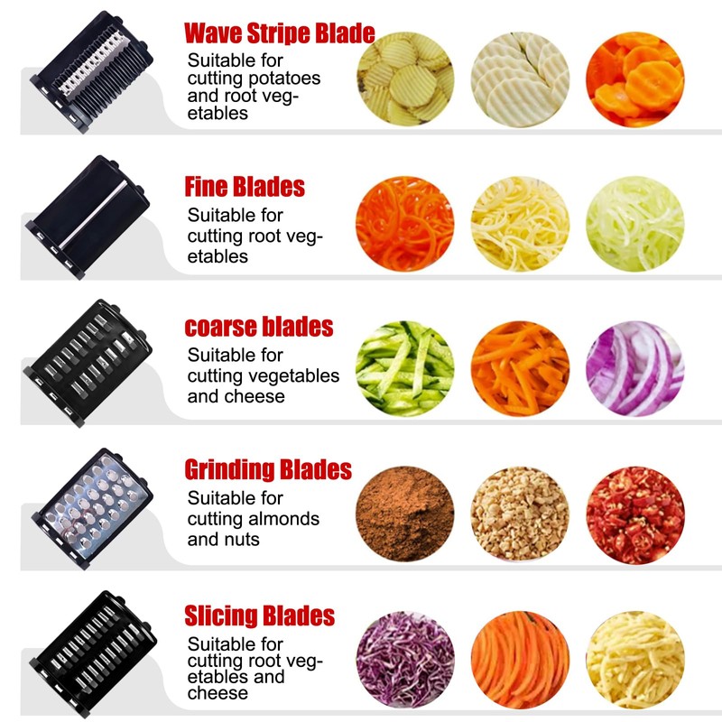 - 5 Stainless Steel Blades - Slicing Blade: Suitable for slicing cucumber, etc. Cutting cone: suitable for slicing cheese, nuts etc. Wavy blade: suitable for cutting potatoes, cucumbers, etc. (wavy chips). Coarse julienne blade: suitable for cutting coarse julienne, onion julienne, etc. Fine julienne blade: suitable for cutting fine julienne, radish julienne, potato julienne, etc.
