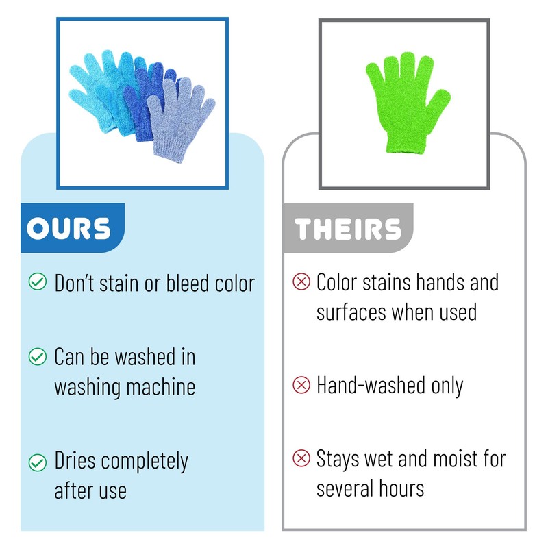 - Slick Solutions exfoliating gloves made of 100% high quality nylon. Package includes 4 pcs premium scrub wash mitts in 4 blue shades
