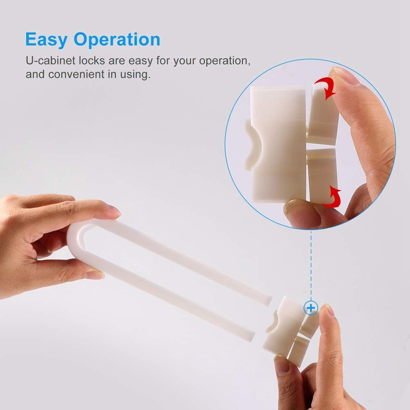 - 【Easy to Install & Portable】No tools, no drilling, no adhesives, no magnets to secure cabinet handle doors. Cabinet locks are very easy to install and remove without damaging your furniture. U shaped baby safety latches is suitable to take them with you when traveling.
