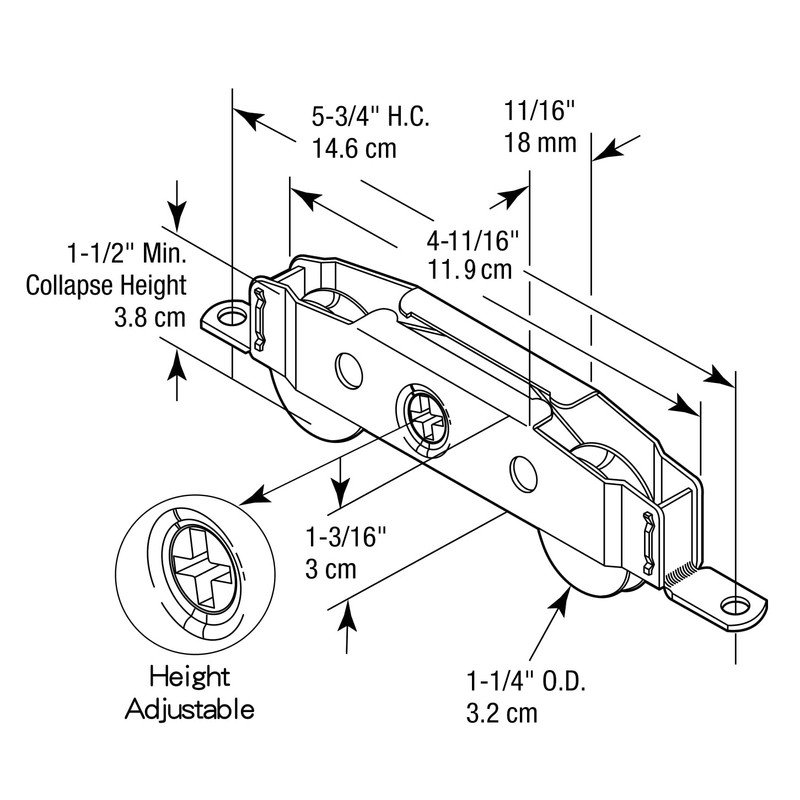 - Dimensions: The roller assembly contains 5/16-inch wheel thickness (width) x 1-1/4-inch diameter, 5-3/4-inch hole centers. Its dimensions include 11/16-inch wide housing, 1-3/16-inch housing height, and 4-5/8-inch housing length.