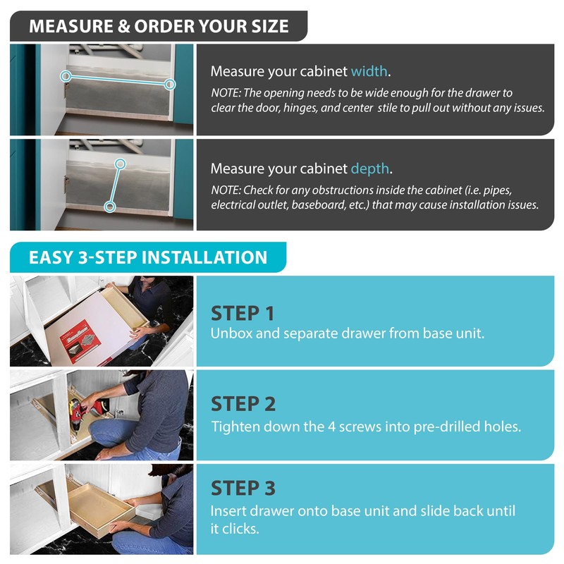 - EASY INSTALLATION: Separate the base and drawer, align the base with your cabinet, install and tighten the 4 included screws, insert the drawer, and slide back until it clicks in place; for best results, pre-drill the holes before installing screws