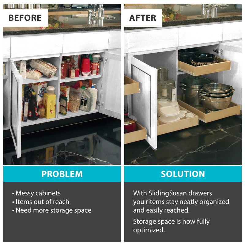 - ORGANIZATION MADE EASY: Clear out cluttered cabinets and inaccessible storage areas with SlidingSusan’s soft-close, full-extension roll-out drawers, the ready-to-use DIY solution for your kitchen, pantry, garage, bathroom, or any cabinet in your home