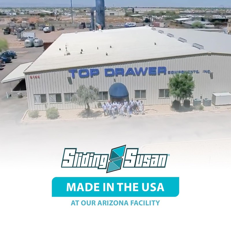 - CRAFTED WITH CARE IN THE USA: SlidingSusan products are manufactured in our state-of-the-art Arizona facility, Top Drawer Components, using processes that eliminate VOC emissions, minimize waste, and maximize quality