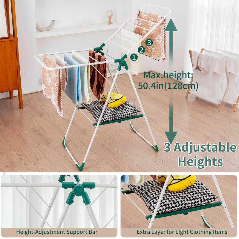- [Adjustable Wings for Versatile Drying] The top two wings feature three height settings (35.5",42" and 50.4"), making it easy to dry clothes of all lengths. From shirts to trousers and even sheets, everything hangs perfectly on this clothes airer.