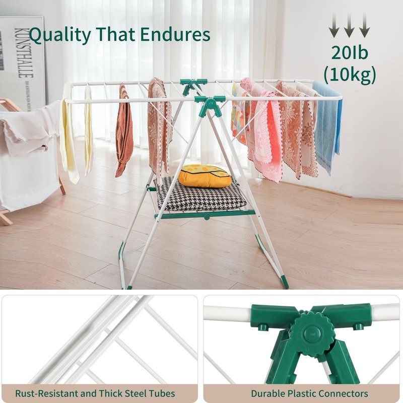 - [Rust-Resistant & Heavy-Duty] Constructed with 3/4" thick steel tubes featuring a specially treated finish and durable plastic connectors, this drying rack supports up to 55 lbs without buckling or rusting, ensuring lasting durability and reliability.