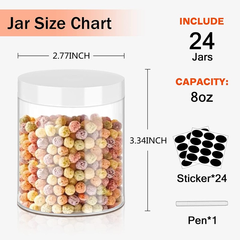 - 【Package & Service】These slime containers set include 24 pcs of durable clear plastic jars, 24 pcs labels and a pen to record. Meet your different daily needs. We focus on product quality and value the shopping experience of our customers highly. If you have any questions about our 8oz plastic jars with lids, please contact us! We will reply to you within 24 hours. Your satisfaction is our goal. NOTE: The slime containers are made of plastic.Do not store hot items. Do not wash in the dishwasher.