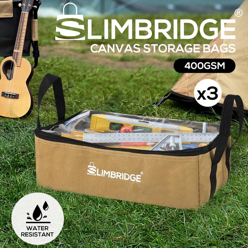 Slimbridge 3PCS Camping Canvas Storage Bags Portable Caravan Adventure Organiser Clear Top 400GSM 405mm x 250mm x 150mm Khaki, Camping Tableware Organize Bag, Portable Hanging Picnic Bag