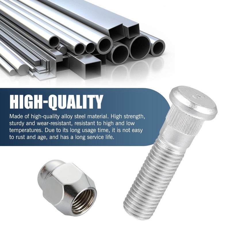 - Easy to Tight Design: This wheel nut set adopts chrome-plating treatment on the surface. Through torque action and nut cooperation, the wheel is firmly fixed to the axle, transmitting the weight of the vehicle body and various forces during driving, ensuring that it will not loosen or break under complex road conditions, and ensuring driving safety.