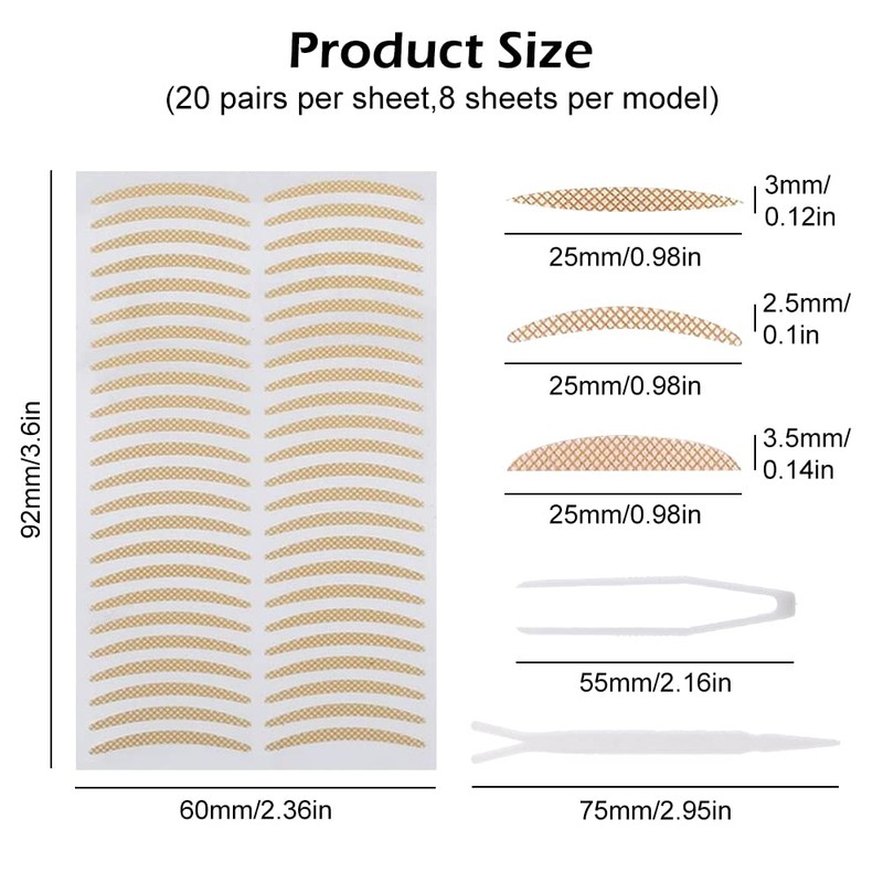 - 3 sizes: the double eye bands have 3 sizes, including 25 x 2.5 mm, 25 x 3 mm and 25 x 3.5 mm; different sizes of eyelid band bring different width of the double eyelid; Please check the size of the eyelid tape carefully before purchasing.