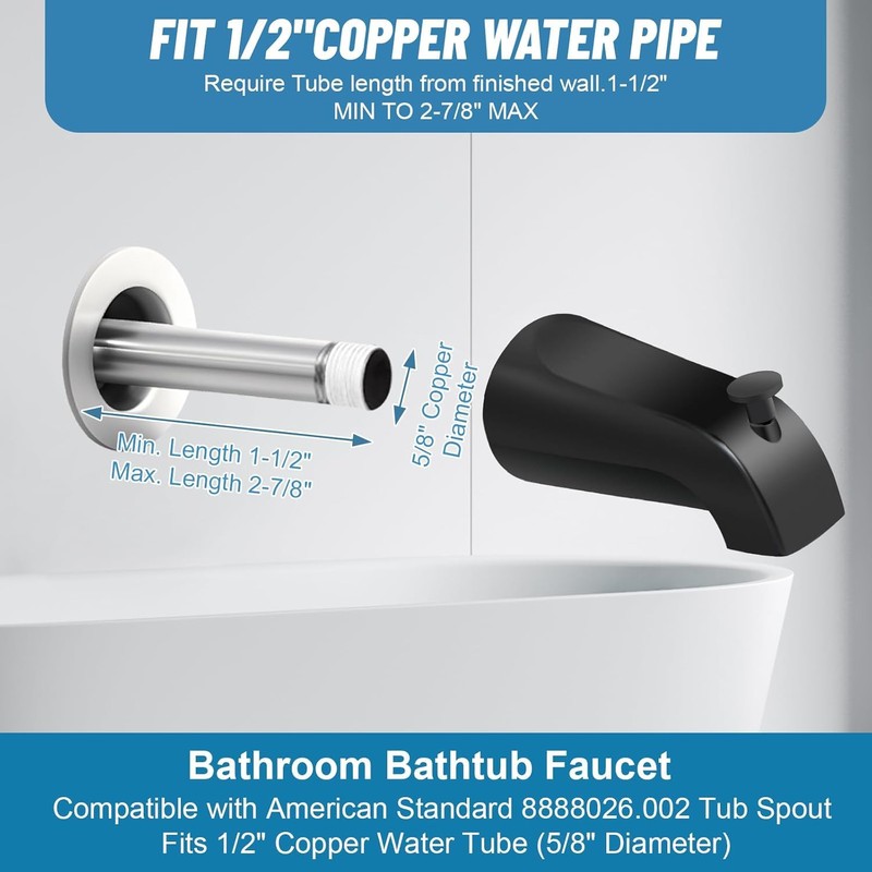 - - Easy Slip-On Installation: Easily install this bathtub faucet with just one screw to tighten, fitting 1/2"(1.3cm) copper water tubes with outer diameter of 5/8"(1.5cm). Minimal tube length required from finished wall: 1-1/2'' to 2-7/8''
