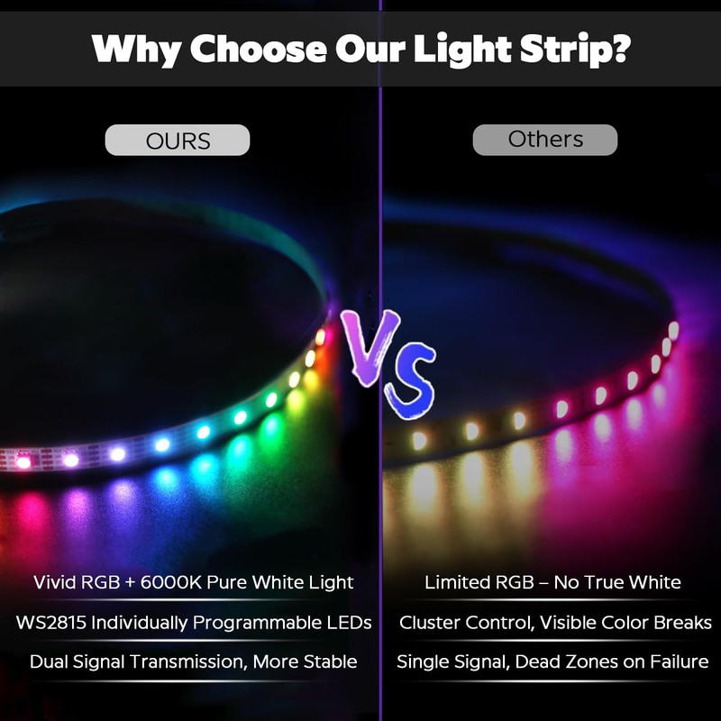 - 【WS2815 + RGBW 6000K Cool White Light】This WS2815 LED Strip integrates RGB color control with a dedicated 6000K cool white channel (4-IN-1 RGBW), offering independent dual-channel operation for seamless transitions between vibrant color displays and high-precision white task lighting.