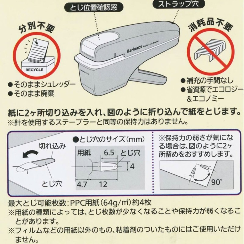 - Does not have the same holding power as a stapler that uses a needle. Depending on the type of paper, there may be fewer sheets or less bleeding. Also, please note that the holding strength may be weakened. Make sure to test with unnecessary paper before using