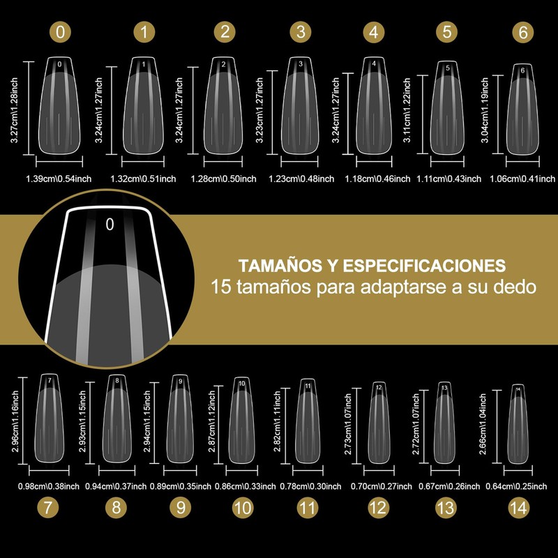 - 💜15 Tamaños: Hay 600pcs en total con 15 tamaños. Usted puede elegir el tamaño adecuado para adaptarse a sus uñas con facilidad y se puede utilizar mucho tiempo con esta caja de puntas de uñas. Se pegarán a tus uñas perfectamente desde el arco hasta el borde libre
