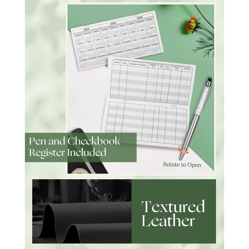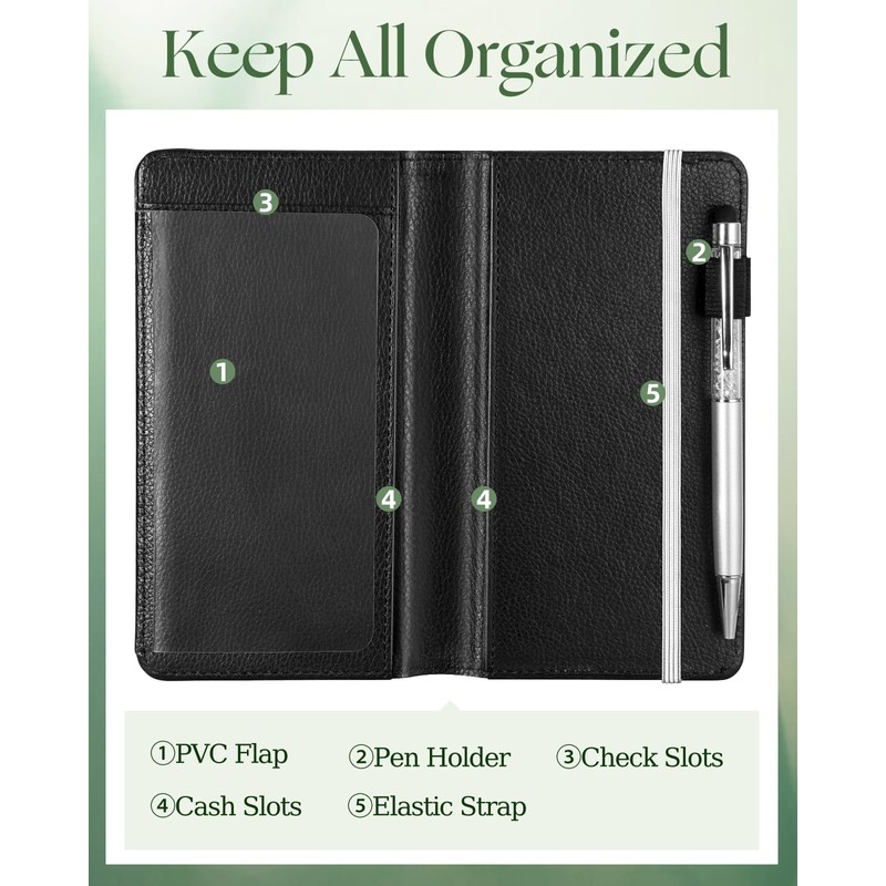 - Checkbook Cover with Check Register - The check register are included. The cover can store personal checkbook registers, cash, pen, etc. It keeps all your essentials organized and within easy reach.