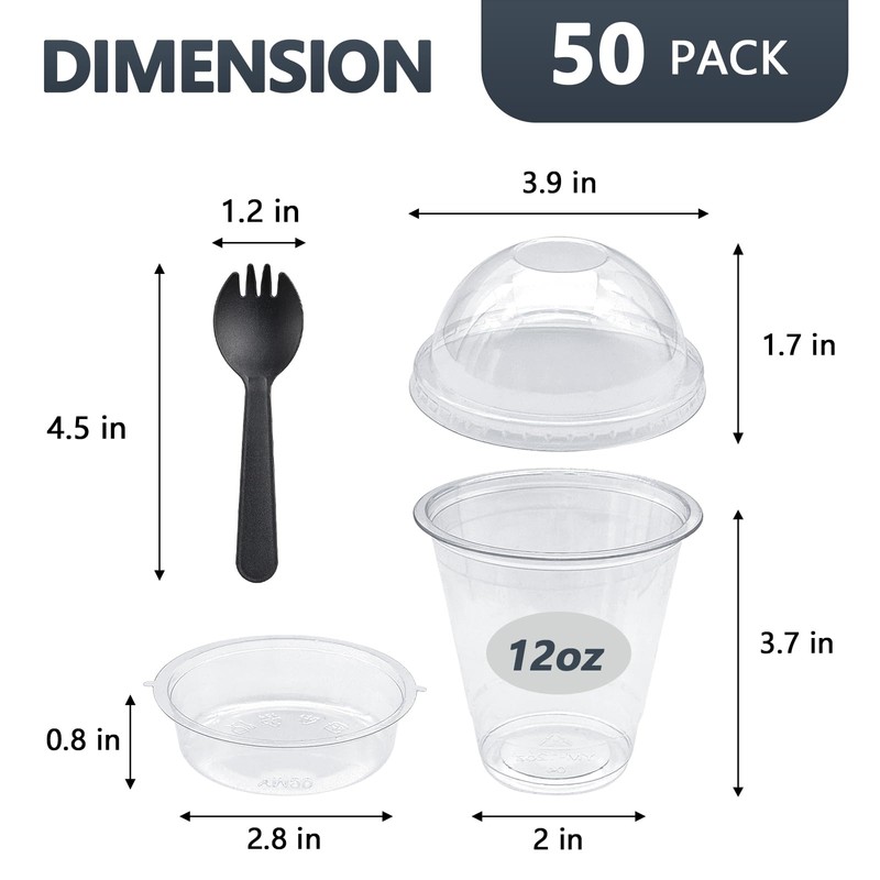 - Package Contents: You will receive 50 12-ounce plastic parfait cups, 50 hole-free dome lids, 50 inserts and 50 sporks. The sufficient quantity can meet your daily needs, and their stackable feature not only saves storage space but also makes it easy to carry and transport, making it an ideal choice for both home and outdoor use