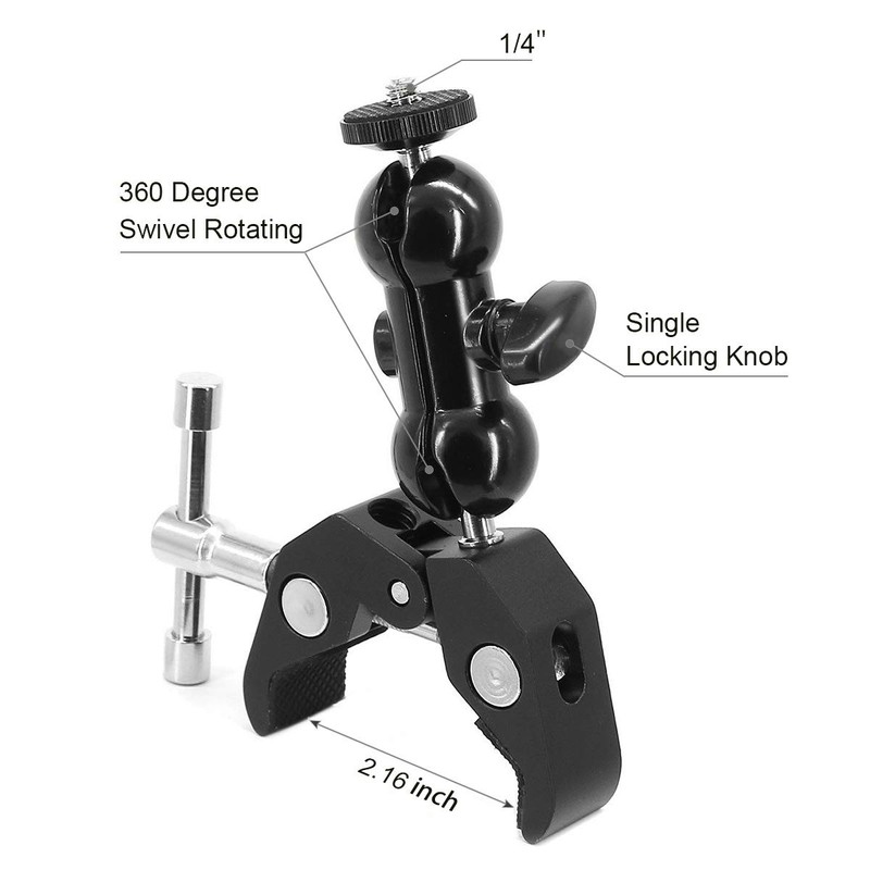 - Double ball mount with 360 degree swivel Articulation for easy direction. Single locking knob for quick and safe locking.Standard 1/4"-20 tripod screw on top to mount video monitors and small led lights.