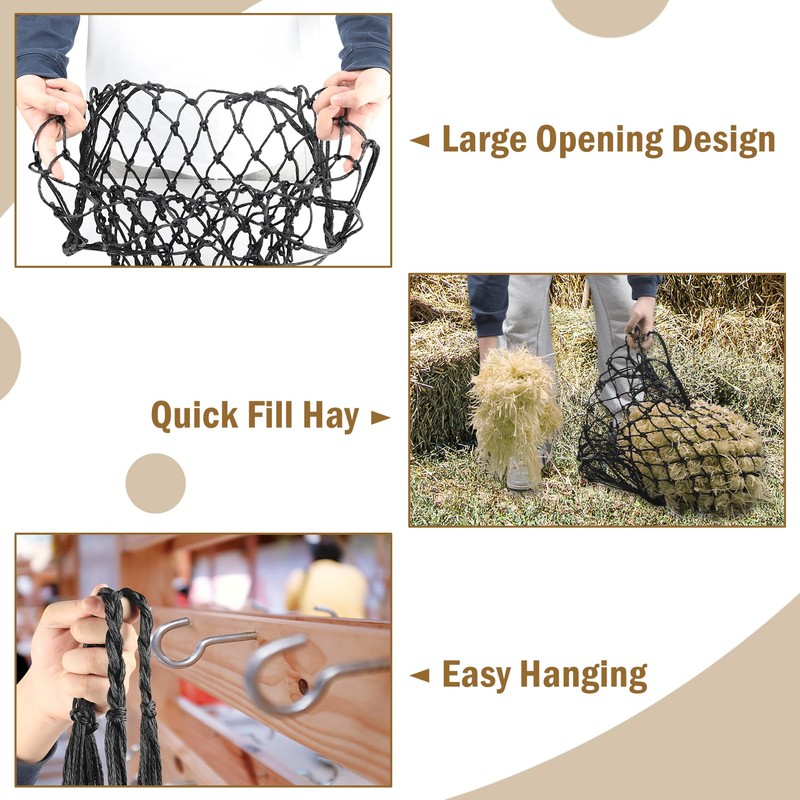 - [Unique Opening for Easy Feeding] This slow feed horse hay net features a unique opening design that allows for quick filling and easy hanging, making it the perfect choice for all animal owners. Its efficient design ensures that you can quickly fill the hay and hang it up, simplifying your daily feeding routine. This horse hay net not only improves convenience, but also ensures that you and your animal enjoy a worry-free feeding experience