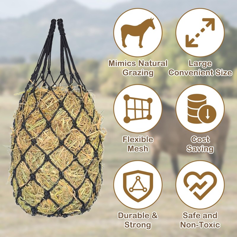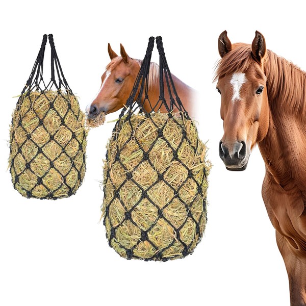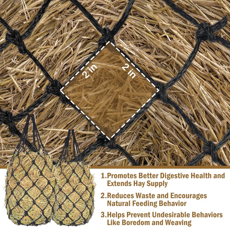 - [Efficient and Healthy Feeding Program] Designed with 2" holes, this hay net for horses encourages horses, goats, donkeys and cattle to eat less, promoting better digestive health and extending hay supply. The small hole rope net slows down feeding, reducing stomach problems and indigestion. It minimizes waste and combats undesirable behaviors like boredom and weaving by encouraging natural eating habits. This durable hay net ensures a healthier feeding experience for your animals