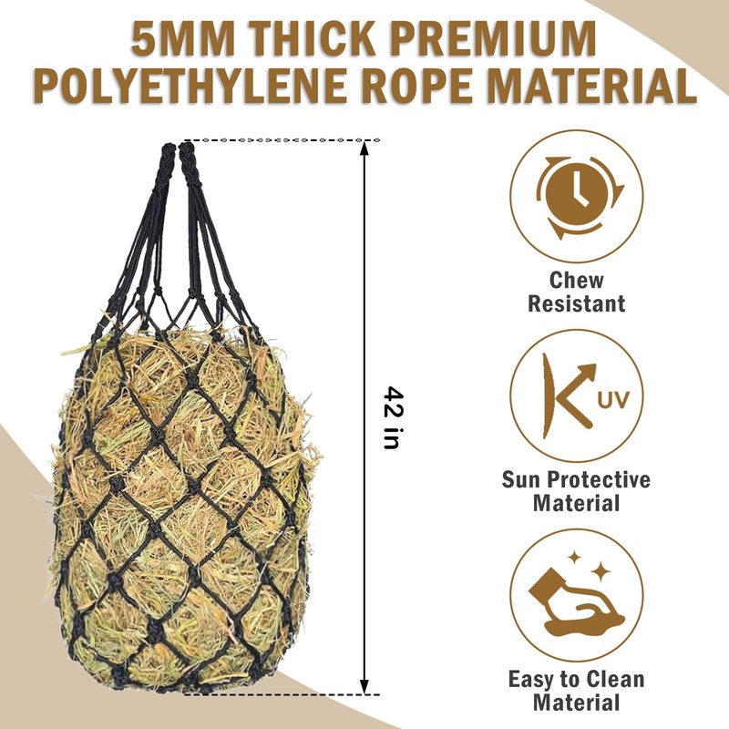 - [Durable and Spacious Design] This 42" slow feed hay net is made of 5mm(0.197 inches) thick premium Polyethylene rope, suitable for long-term use in all weather conditions. Its durable material is wear-resistant, chew-resistant and easy to clean, ensuring reliable performance and longevity. This hay net for horses provides ample feeding space and reduces the need for frequent refilling - making it an ideal choice for busy horse owners