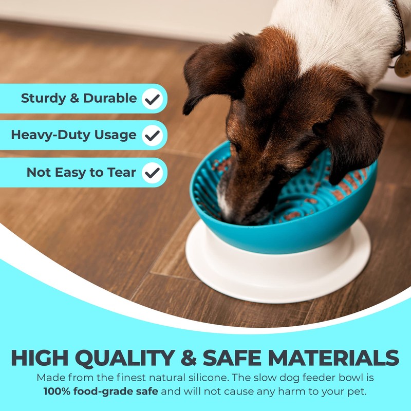- HIGH QUALITY AND SAFE MATERIALS – Made from the finest natural silicone that is sturdy, wear-resistant, and durable, this raised slow dog feeder bowl can withstand heavy-duty usage, will not easily rip or tear, and is sure to be long-lasting. The lick bowl set for dogs is 100% food-grade safe and will not cause any harm to your pet.