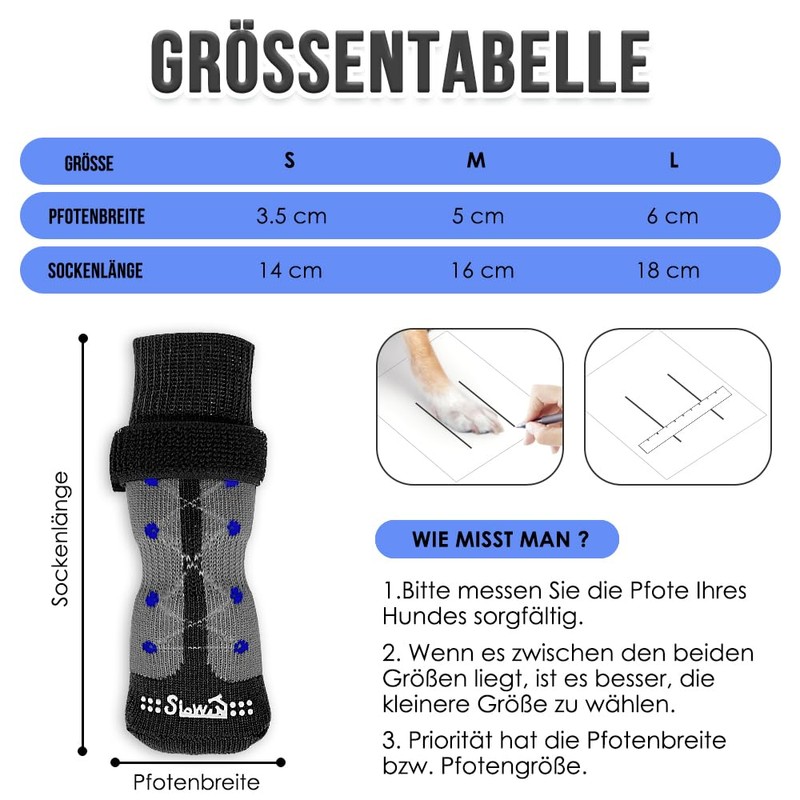- Various size options: the dog socks offer a range of 3 sizes to suit different breeds. S (sock length 14 cm, paw width 3.5 cm), M (sock length 16 cm, paw width 5 cm), L (sock length 18 cm, paw width 6 cm). Measure your pet's paw size before purchasing. If your measurement is between two sizes, it is recommended to choose the smaller size. This choice is recommended due to the elastic fabric composition of the socks.
