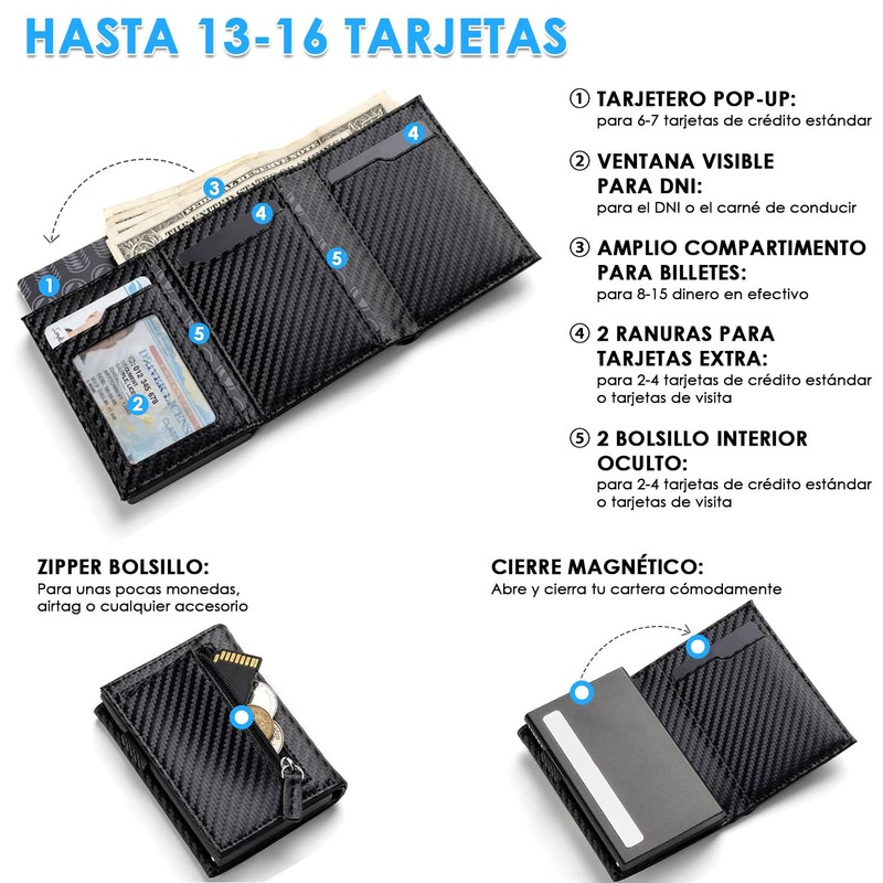 - Gran capacidad --- Extraiga fácilmente hasta 13-16 tarjetas con el extractor de tarjetas de acceso rápido situado en el lateral de la cartera. El tarjetero inteligente garantiza un acceso fluido a sus tarjetas esenciales, mientras que el espacioso compartimento para efectivo tiene capacidad para entre 8 y 15 billetes. Además, cuatro ranuras internas adicionales para tarjetas pueden contener 1 o 2 tarjetas de crédito o tarjetas de visita estándar cada una, ofreciendo un amplio espacio de almacenamiento para todos sus elementos esenciales.