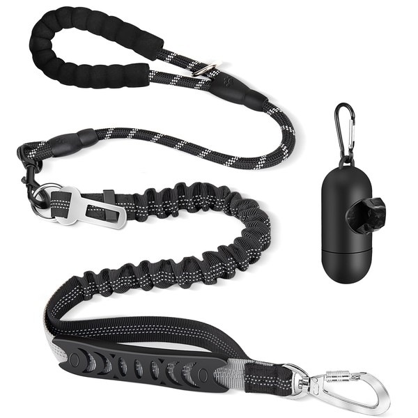 SlowTon Dog Leash, Heavy Duty Bungee Dog Leash, Comfortable Padded Handle and High Reflective Strip, Dog Leash with Car Seat Belt, Durable and Non-Tangled, Suitable for Medium and Large Dogs (Black)