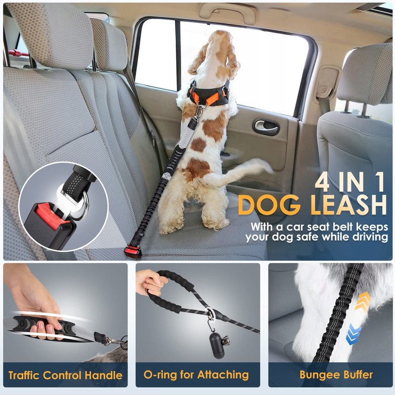 • Two in One --- It can be used not only to walk the dog, but also to be used as car seat belt,with 360°tangle-free rustproof swivel hook to prevent from interwining, lockable car safety buckle ensures great safety in vehicle while driving.O ring at the end of the handle could be used to hang accessories, like bowl ,key, poo bag etc. Free one roll poop bags with dispenser as a nice extra bonus, no bad smell.
