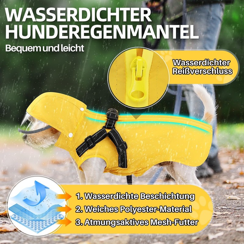The dog raincoat is equipped with a transparent EVA hood with reflective brims and can help protect against rain, wind and snow without obstructing your pet's vision, and improve visibility in low light environments to keep dogs safe