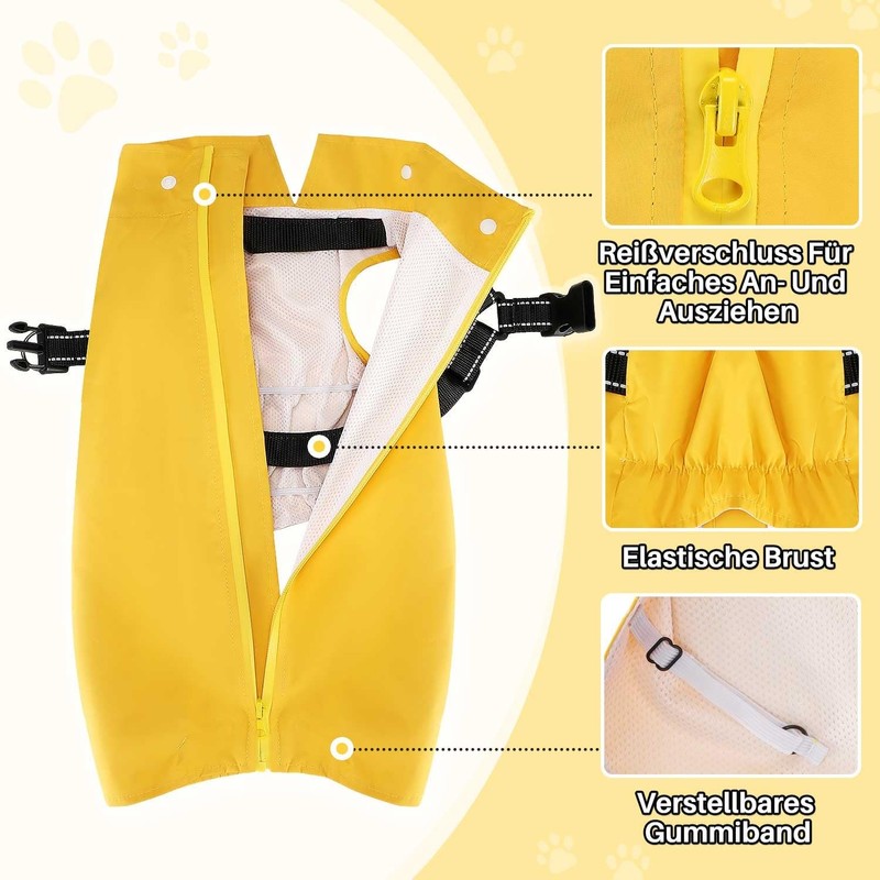 - Dog raincoat with soft mesh lining --- The dog raincoat is made of double-layer fabric, with waterproof polyester fabric on the outer layer and soft, breathable mesh fabric on the inner lining. Even in harsh weather conditions, your pets will stay dry and comfortable for fearless travel.