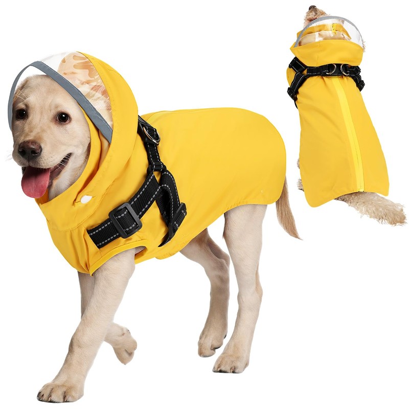 - Removable transparent hood and reflective brim --- This rain jacket for dogs is equipped with a transparent EVA hood that protects against rain, wind and snow without obstructing your pet's vision. The EVA brim has a reflective trim to increase visibility at night or on cloudy rainy days and increase safety during outdoor trips.