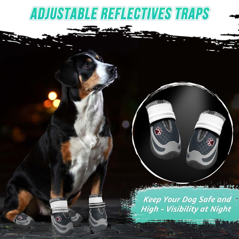 SlowTon Dog Shoes for Large Small Medium Dogs - Breathable Dog Boots with Reflective Strips, Paw Protector for Summer Hot Pavement Outdoor Walking, Anti-Slip Dog Booties for Winter Snow(4 Packs #4)
