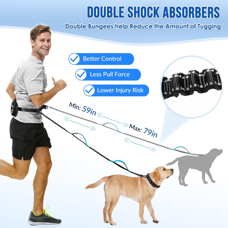- 【Shock Absorbing & Reflective Stitching Design】 Dual elastic bungees reduce tugging force by 50%, protecting both you and your dog from sudden pulls. Reflective stitching on the leash and pouch enhances nighttime visibility, ensuring safer dawn/dusk outings.