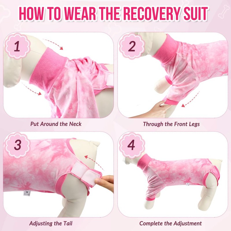 - Easy to wear --- Our recovery suit for dogs is equipped with an adjustable Velcro fastener on the back, which can be easily adjusted to the size and comfort of your dog. The elastic edges of the suit can avoid rubbing or cutting your dog's legs and tail. The elastic collar makes it easy to put on and take off the dog suit and saves you time and energy.