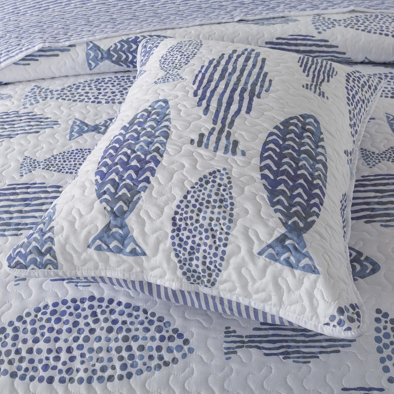 - CHEERFUL PRINT: This playful quilt set with fish graphics will blend swimmingly with any décor style. It's the catch of the day and the bright touch that every home needs to keep things light-hearted. This quilt reverses to a subtle blue wave.