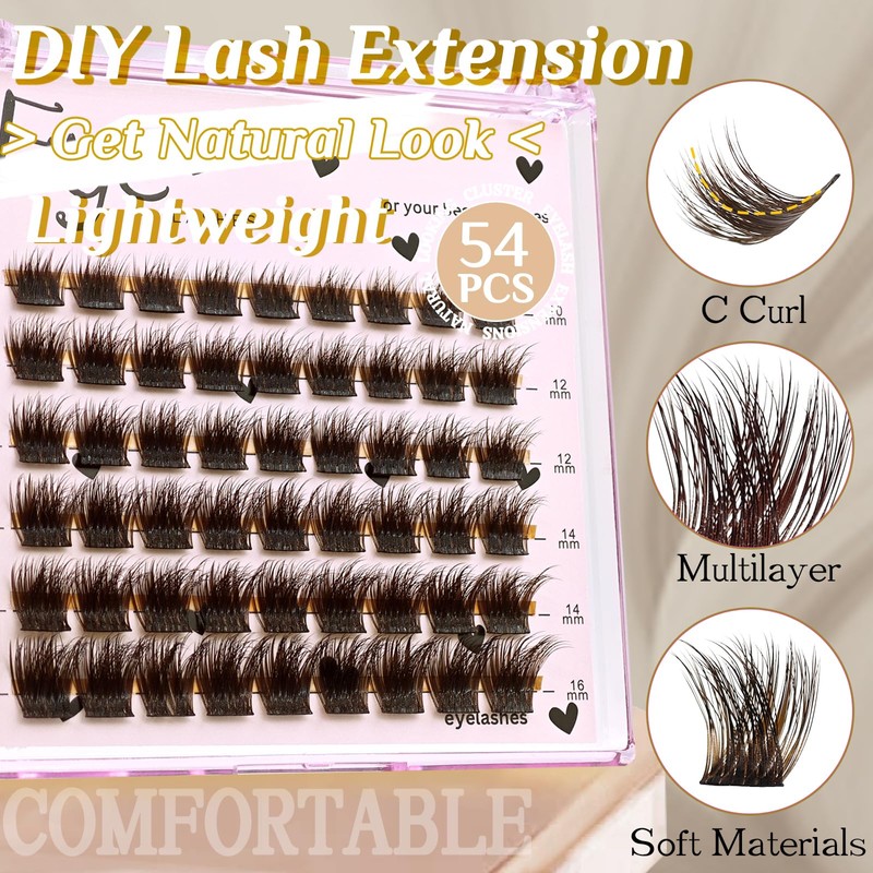 - DIY Lash Clusters Eyelash Extensions: This wispy eyelash clusters kit is 54pcs value pack.There are 4 different lengths in one cluster lashes kit-10mm, 12mm, 14mm and 16mm