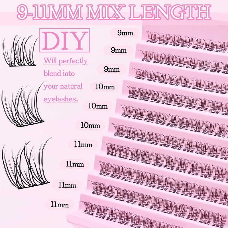 - Lash Clusters DIY Eyelash Extensions: This wispy eyelash clusters kit is 110pcs value pack.There are 3 different lengths in one cluster lashes kit-9mm, 10mm and 11mm.You can DIY your lashes as you like.For example, wearing 9mm lashes clusters at the top of the eye and 11mm at the end of the eye