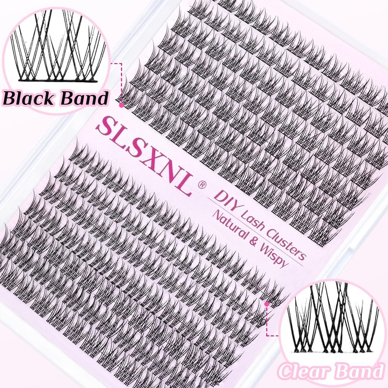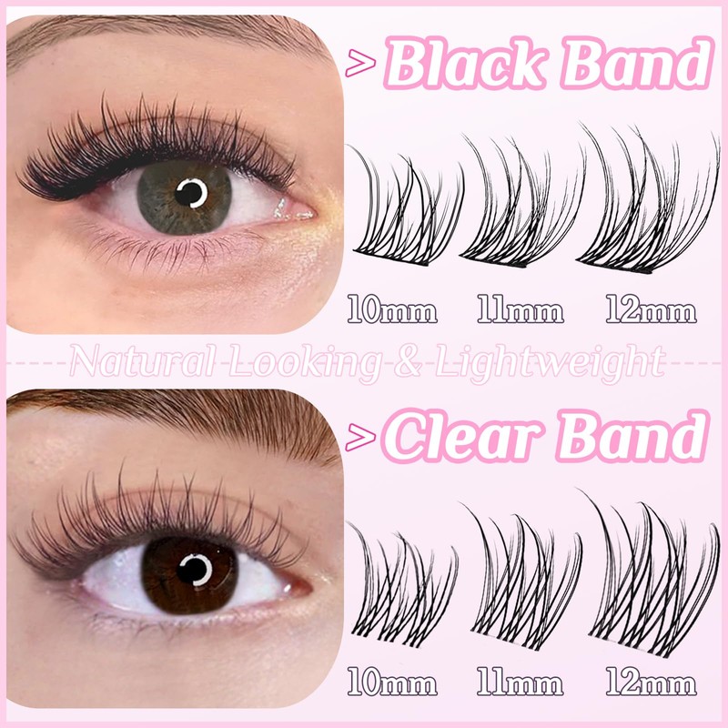 - Clear Band & Cotton Band Lash Clusters: There are two styles of lash bands in 1 set.The black band brings an eyeliner effect.The clear band brings more natural effect for daily wear and great for beginners.The band is thin and flexible.You can match different lash look as you like