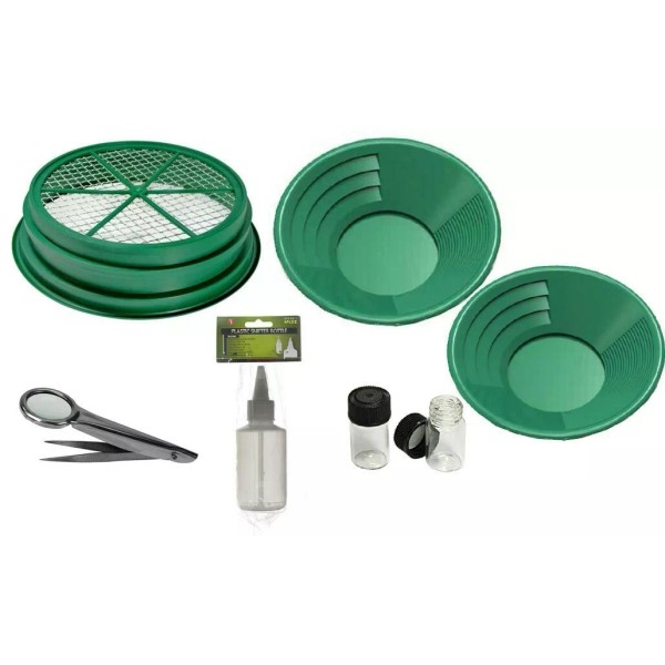 - 1Pc Sifting Pan(Mesh Size: 1/2”, 1Pc 10" Gold Pan, Dual Riffles(3" x 1/4" Deep Riffles, Micro Riffles), Plastic Body, Green Color 1Pc 14” Gold Pan, Dual Riffles (3 x 1/4” Deep Riffles, Micro Riffles). Plastic Body, Green Color 1Pc 5x Tweezer With Magnifier, Made in China, Glass Lens, Plastic 1Pc 8.1/4" Plastic Snifter Bottle For Gold Panning, 4 FL Oz 2 Pc Glass Vials