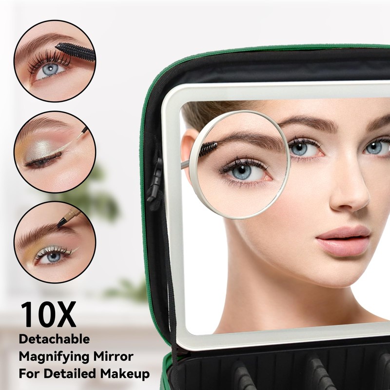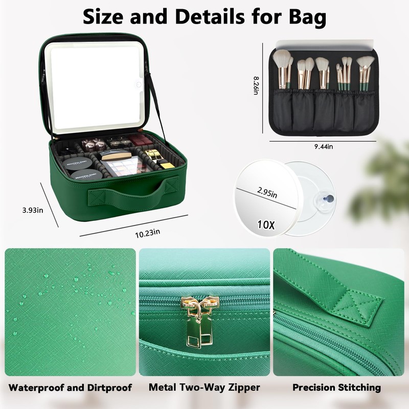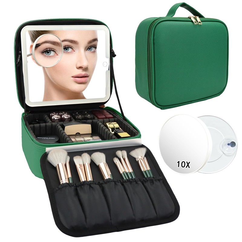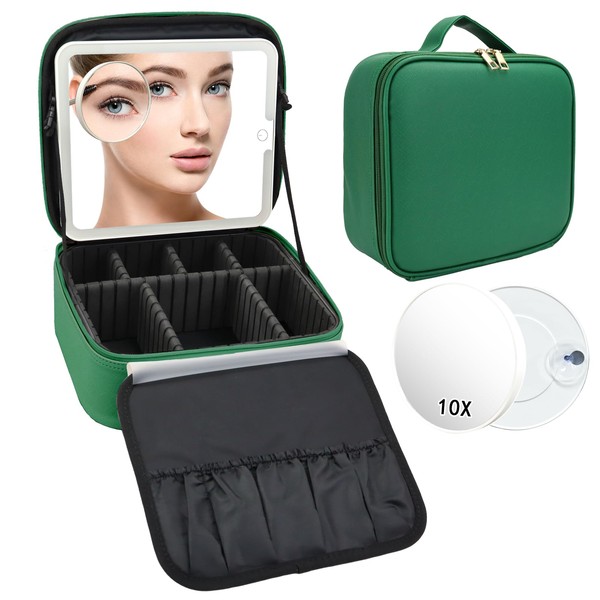 SLUMAZI Travel Makeup Bag with LED Mirror and 10x magnifying glass with 3 Lighted Settings, Adjustable Dividers and Makeup Brush Storage Bag Dark Green