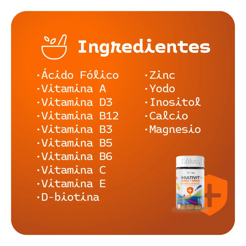- ¡Dulces beneficios para los más pequeños! Multivit Niños ofrece vitaminas y nutrientes esenciales en un formato práctico y delicioso. Diseñadas especialmente para niños, estas gomitas multivitamínicas son una forma divertida de complementar su alimentación diaria y apoyar su desarrollo. Ingredientes destacados y sus aportes: ° Calcio: Esencial para el desarrollo normal de huesos y dientes. ° Vitamina D: Apoya la absorción de calcio y el desarrollo óseo. ° Vitamina C: Contribuye al funcionamiento normal del sistema inmunológico. ° Zinc: Favorece el crecimiento y el mantenimiento del sistema inmunológico. ° Vitaminas del Complejo B: Apoyan el metabolismo energético y contribuyen al desarrollo integral. Características del producto: ° Complemento alimenticio en presentación de gomitas. ° Fórmula pensada para niños, con nutrientes clave para su desarrollo. ° Práctico, delicioso y fácil de incorporar en la rutina diaria. Modo de uso: Consume 2 gomitas al día, en el momento que prefieras. Almacénalas en un lugar fresco y seco, lejos del calor y la luz, y mantén el envase bien cerrado. Aviso legal: Este producto no es un medicamento. Consulte a su médico antes de consumir cualquier complemento. Su uso es responsabilidad de quien lo recomienda y consume. Aviso legal