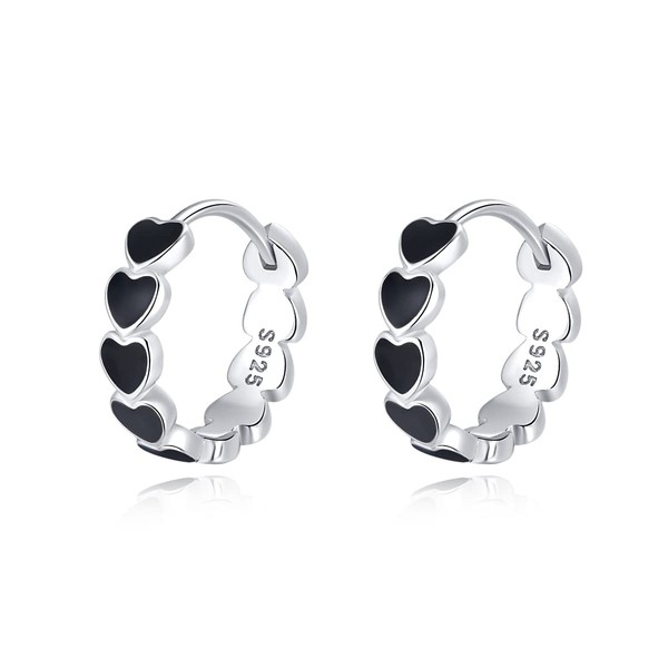 SLUYNZ 925 Sterling Silver Black Heart Hoop Earrings for Women Teen Girls Minimalist Black Hoop Earrings 1.5CM Hoop Earrings (A-Silver)