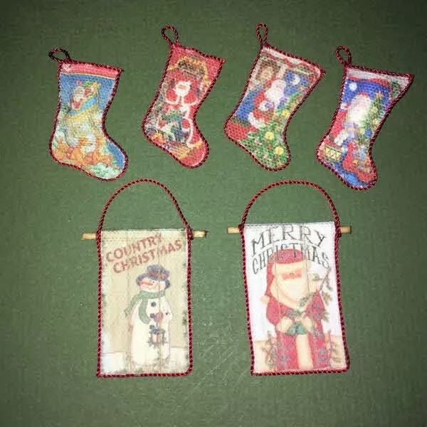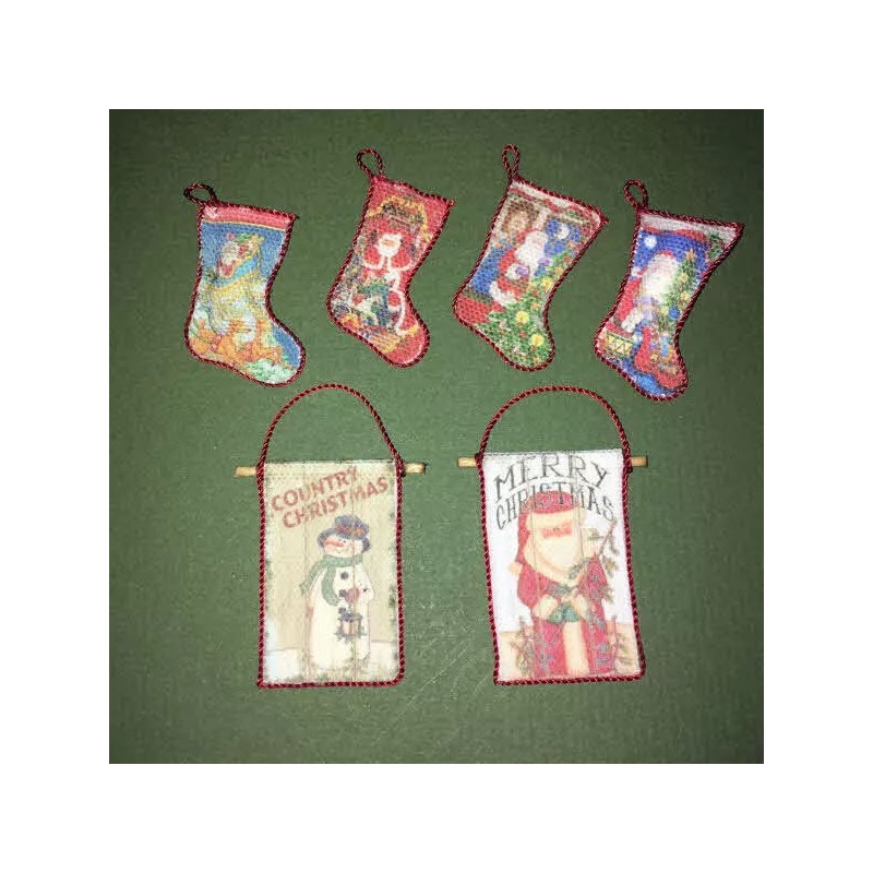 Kit includes canvas printed fabric and trim to create 7 Stockings and 6 Banners.