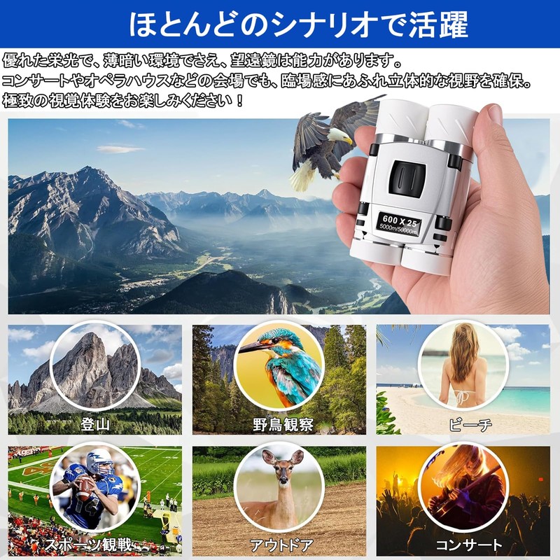 - 【2025新登場ライブ用双眼鏡・20倍高倍率】Smalife双眼鏡持続的な改良と倍率限界の突破により、新しいアップグレードでは倍率が 20倍に向上し、6.5°の超広視野、500m先の人を裸眼で10m先から見るのと同じ大きさで見えるという事。東京ドームの最後列でも、20倍双眼鏡で、スポーツの試合や音楽パフォーマンスをはっきりと見えます。演劇、ステージパフォーマンス、バードウォッチング、自然観察、アウトドアアドベンチャーなどのアクティビティに適しています。そんな願いを叶える双眼鏡が登場!