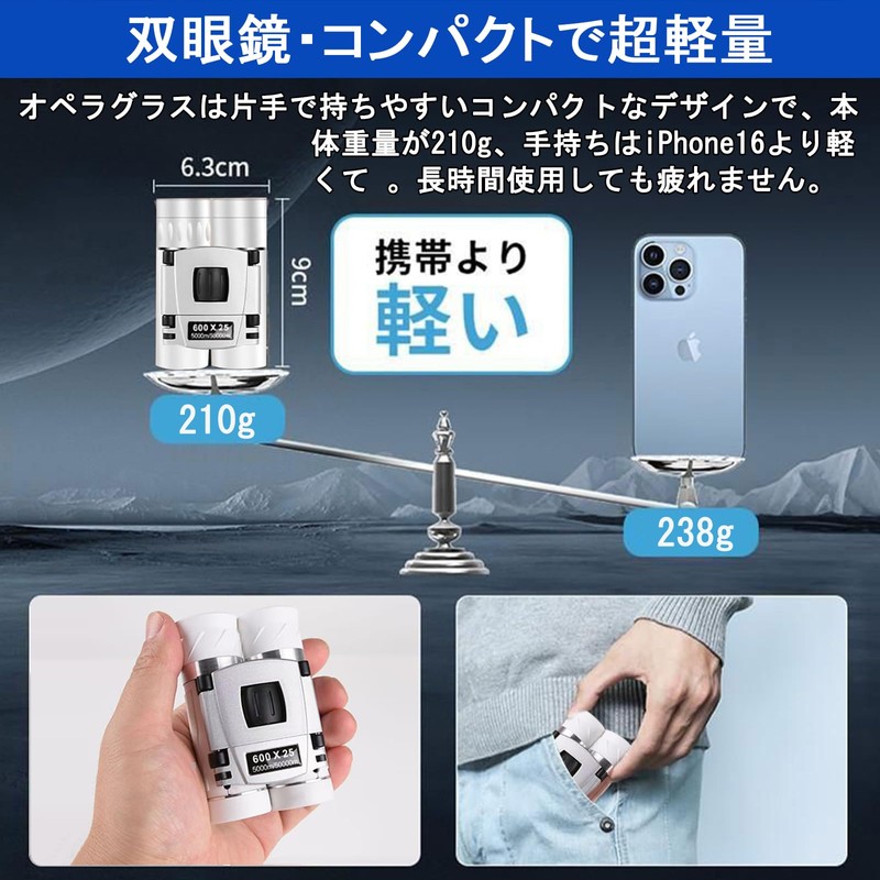 - 【双眼鏡 ライブ用 ドーム・コンパクトで超軽量】オペラグラスは片手で持ちやすいコンパクトなデザインで、本体重量が210g、手持ちはiPhone16より軽くて 。滑り止め素材と人間工学に基づいたデザインにより、最大限の労力を節約できます。折りたたむと手のひらサイズになり、女性やお子さんも長時間持っても疲れない。コンパクトでカバンや首掛けて持ち歩いても邪魔になりません。いつでも取り出すと、すぐに観察できます。スタイリッシュで洗練された外観で、バッグの中に入れたり、首や手にかけたりすることができ、持ち運びに便利である。