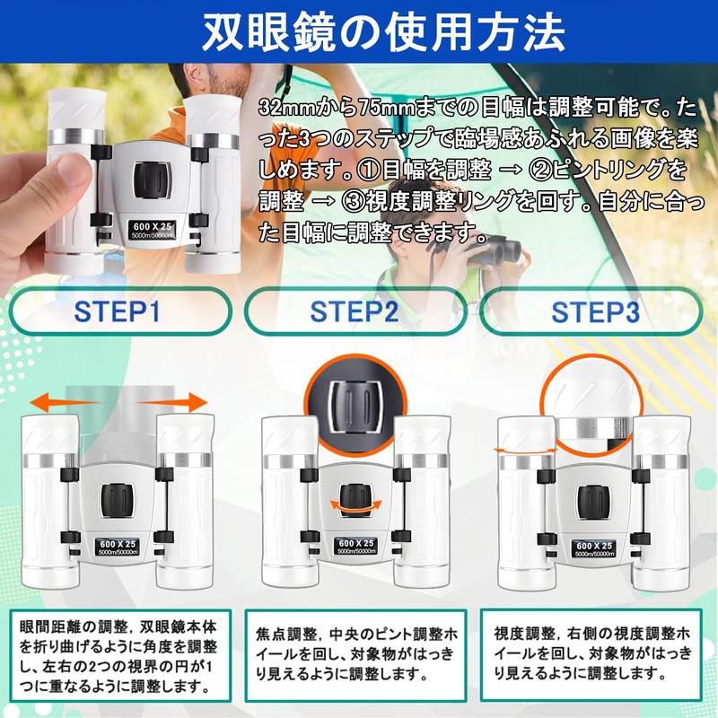 - 【双眼鏡 スポーツ観戦用・使用方法】32mmから75mmまでの目幅は調整可能で。たった3つのステップで臨場感あふれる画像を楽しめます。①目幅を調整 → ②ピントリングを調整 → ③視度調整リングを回す。自分に合った目幅に調整できます。重専用収納ポーチやレンズクリーニングクロス、日本語取扱説明書が付属しています。首に掛けられるストラップが付属しており、いつでも手に取って使用できます。1年以内に使用中に問題や故障が発生した場合は、弊社にご連絡ください。弊社のアフターセールスチームは24時間オンラインでお客様へのサービスに専念しています。