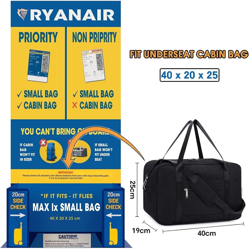 - ✅ SAVE YOUR EXTRA CHARGES : Maximise your packing capacity with this holdall, designed for Ryanair's new main hand luggage allowance. It's the perfect piece of hand luggage for the new regulations! Dimensions: 40x20x25cm, Weight: 0.45kg, Capacity: 20L