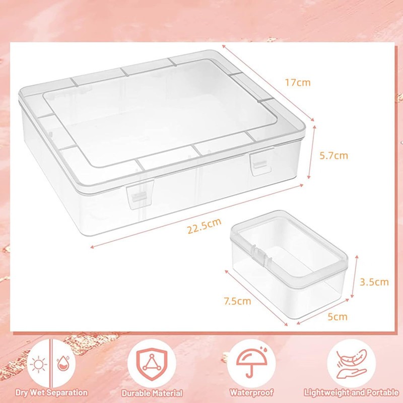 - [Dimensions]: Each mini box measures 5*5*3.5cm/2.95 x 1.96 x 1.37 inch (L x W x H).The outer big storage boxes measures about 22.5*17*5.7cm/8.85 x 6.69 x 2.24 inch (L x W x H).Each single clear storing case is convenient and handy pocket size.